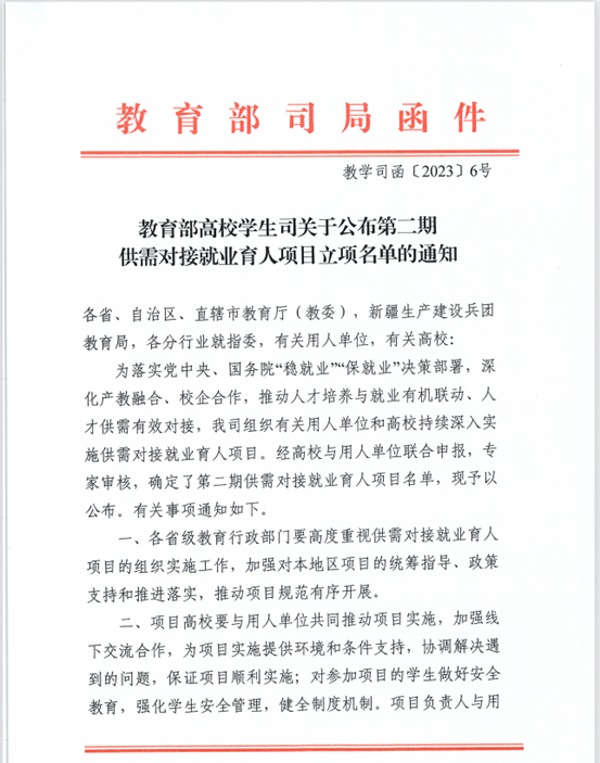 据悉,教育部供需对接就业育人项目于2021年启动实施,旨在深化产教融合、校企合作,推动人才培养与就业有机联动、人才供需有效对接。通过开展定向人才培养、建立就业实习基地、实施人力资源提升和加强重点领域校企合作,广泛搭建校企合作平台,大力拓展学生就业渠道,实现校企互利共赢、共同发展。